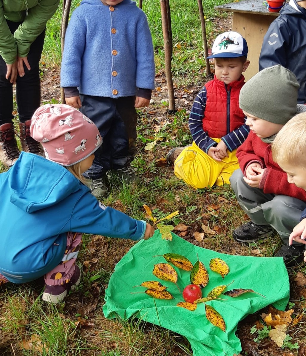Die Ferienzeit geht zu Ende und wir begrüßen alle Kinder und ihre Familien recht herzlich in unserem Kindergarten! Manche kennen sich schon aus, andere fangen gerade erst an. Das ist eine spannende Zeit, bis sich alle kennengelernt haben. In der Waldgruppe in Daim freuen wir uns über die schönen spätsommerlichen Tage und haben die ersten bunten Blätter entdeckt. Auch die Apfelbäume auf der Wiese tragen runde rote Äpfel, die wir uns schmecken lassen. Direkt frisch zur Brotzeit, als leckeres Apfelmus oder als selbst gepresster Apfelsaft. Dazu singen wir unsere Herbst- und Apfellieder, die uns so viel Spaß machen. Bei den Wanderungen in den nahen Wald finden wir auch noch viel mehr – Eicheln, Zapfen, Bucheckern und Moos. Daraus entstehen gemütliche Zwergenhäuser, lustige Eichel- und Kastanienketten und Zapfenmobiles. Die gute Luft, die Bewegung und die Herbstsonne tun uns allen gut und machen manchmal auch ein wenig müde – wie es sich für einen Kindergartentag im Wald gehört. Und am nächsten Morgen treffen wir uns ausgeschlafen wieder im Kreis und starten gemeinsam in einen neuen spannenden Tag im Wald.